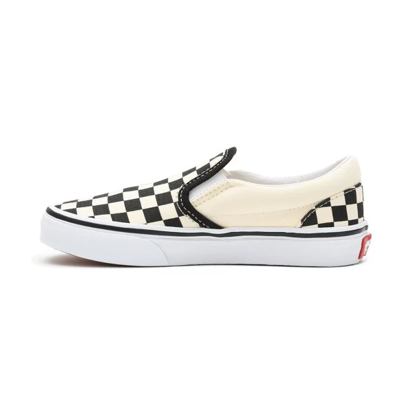 Las Checkerboard Classic Slip-On son unas zapatillas bajas sin cordones que tienen una pala de lona con el emblemático estampado damero de Vans, cuello acolchado, detalles laterales elásticos y la distintiva suela waffle de caucho.