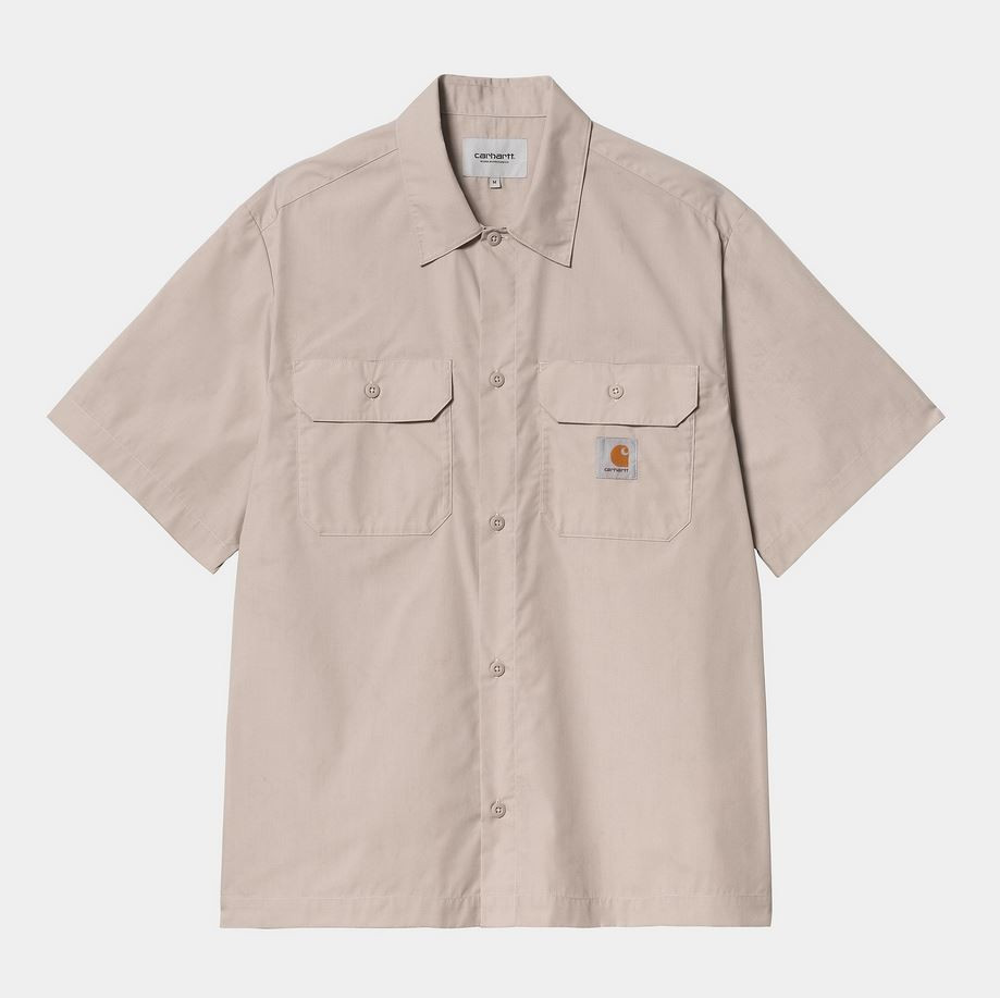 La S/S Craft Shirt está confeccionada en sarga ligera de algodón y poliéster y presenta una pinza trasera que acentúa el corte holgado de la prenda. La camisa cuenta con dos bolsillos en el pecho con solapa y cierre de botón. En el bolsillo izquierdo del pecho aparece una etiqueta cuadrada tejida con un logotipo con texto.
