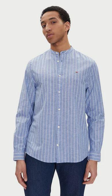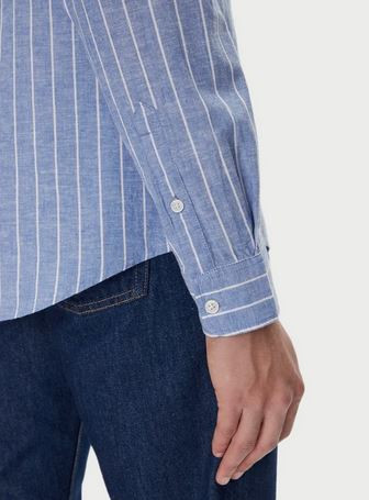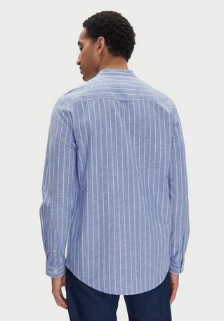 Camisa azul de lino con rayas blancas, cuello mao. De corte regular.