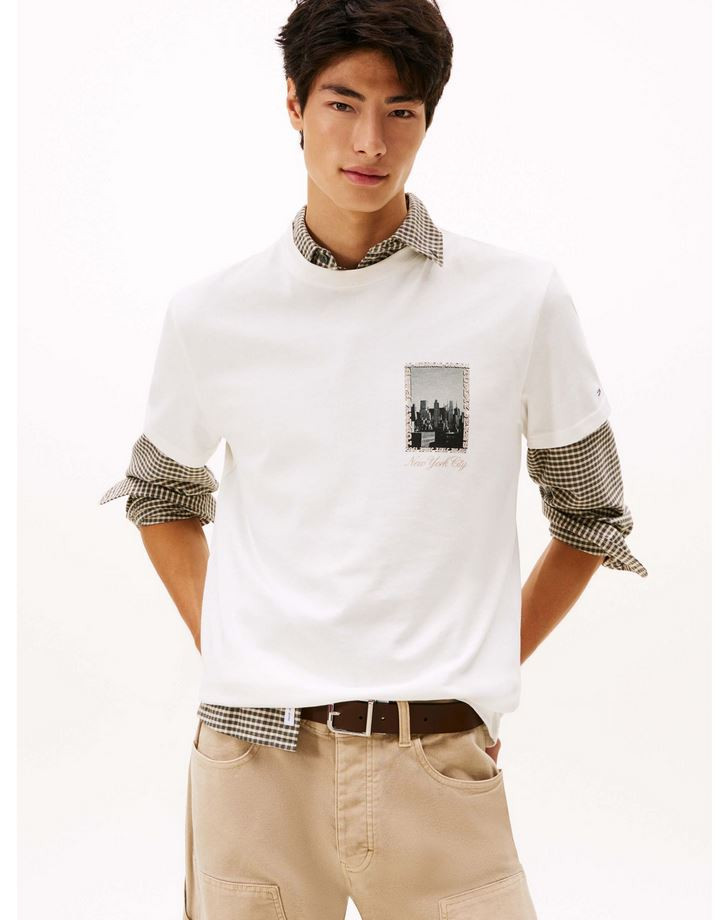 Esta camiseta de punto destaca por la foto del horizonte neoyorquino estampada en el pecho y los detalles distintivos de Tommy Jeans.