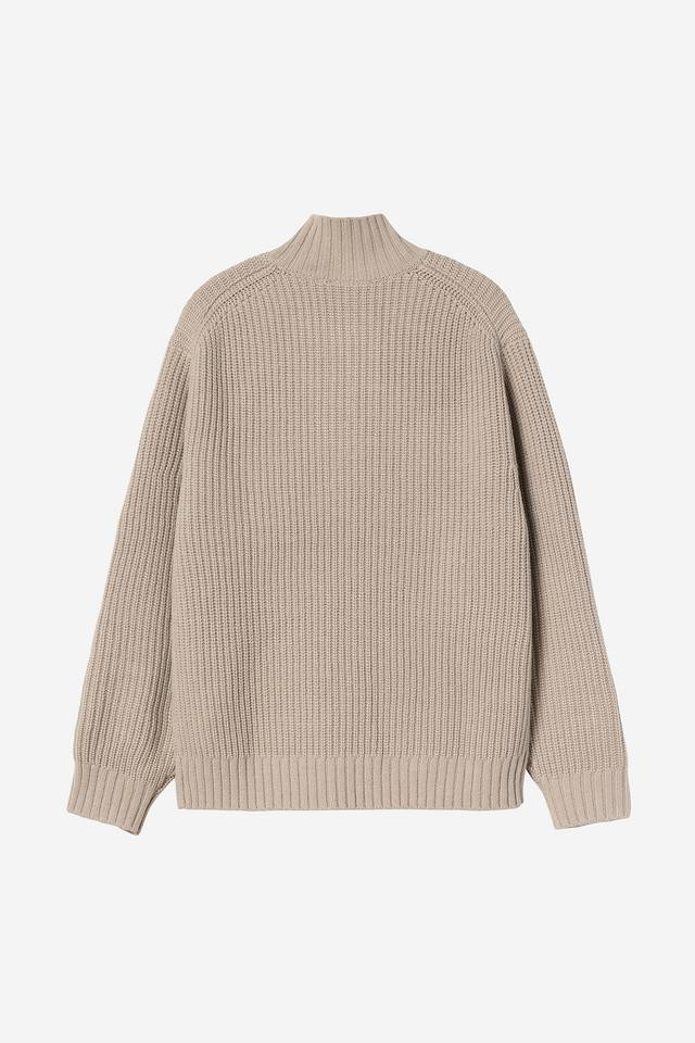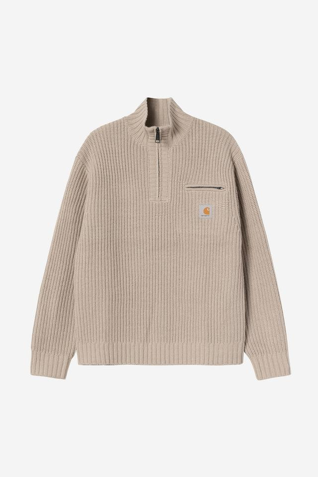 El Detroit Half Zip Sweater se ha tejido con una mezcla de hilo natural y sintético. El modelo presenta un diseño moldeado en las sisas. La prenda presenta un bolsillo con cremallera en el pecho, adornado con una etiqueta cuadrada tejida.